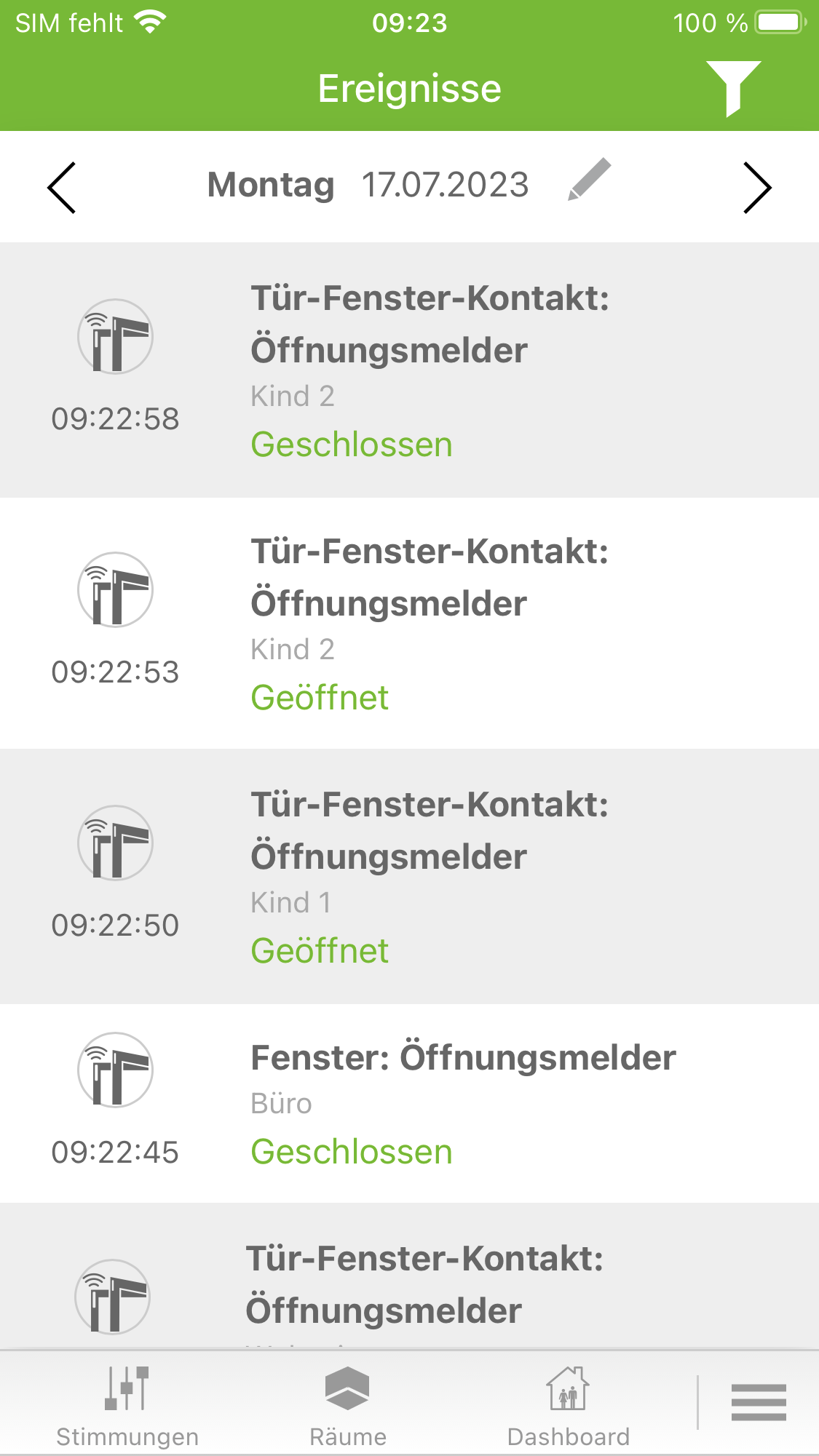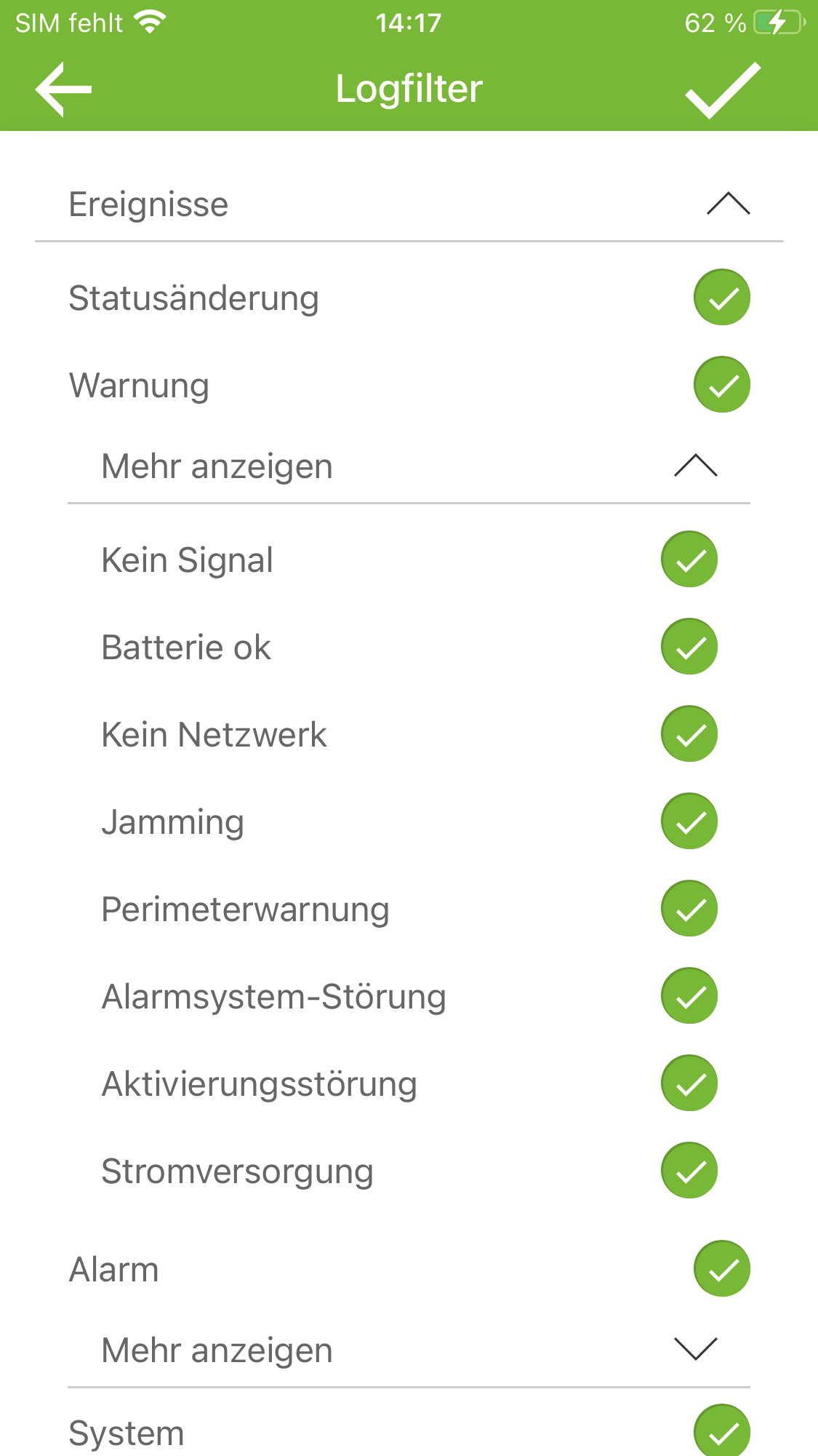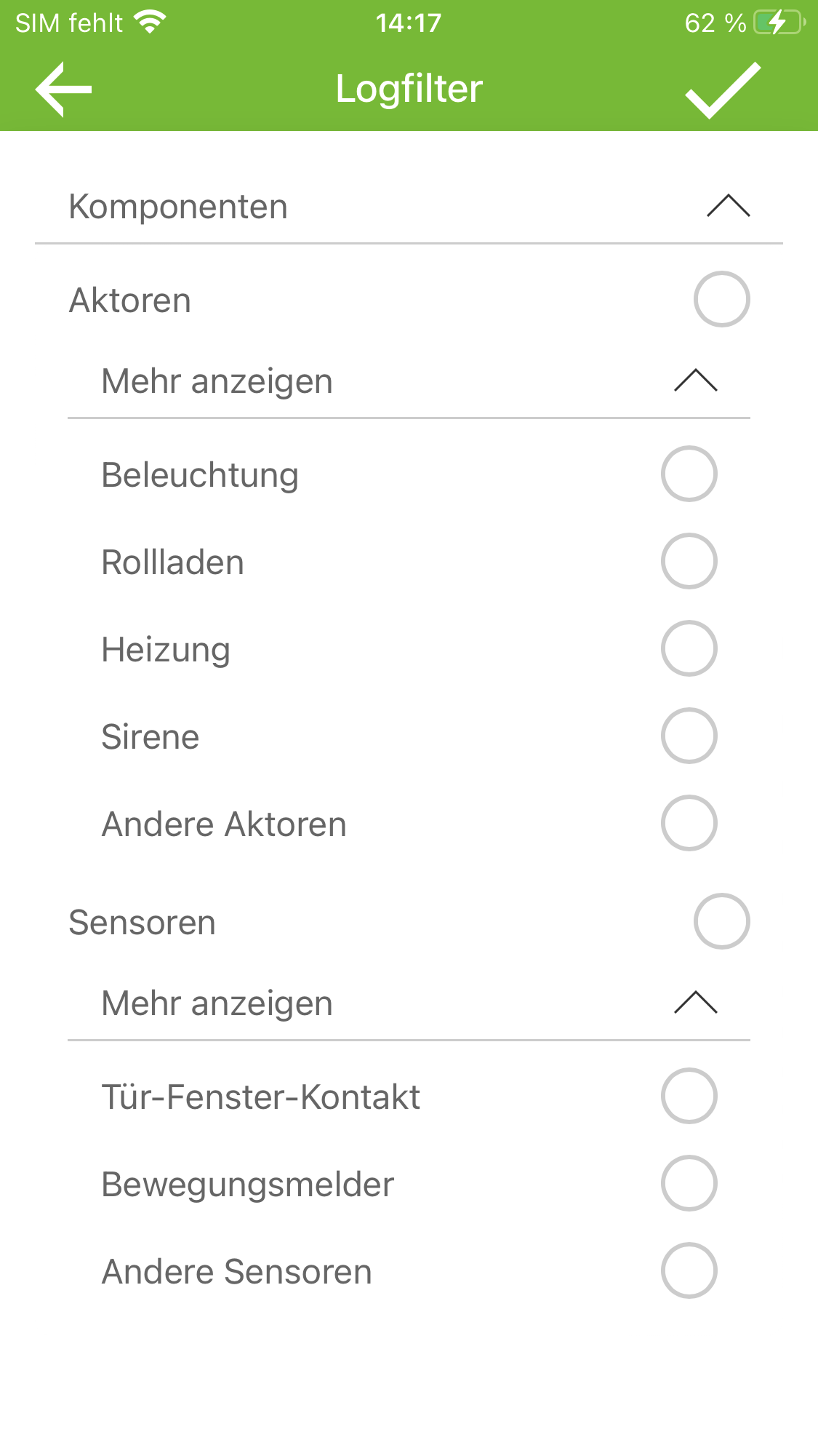 Um in der Fülle der Ereignisse gezielt nach einzelnen Events zu suchen, bietet sich die Filter-Funktion im rechten Bereich der Kopfzeile an. Hier kann die Suche auf Statusänderungen, bestimmte Typen von Warnungen oder Alarmen, Zustandsänderungen von Sensoren oder Aktoren und System-Events beschränkt werden.