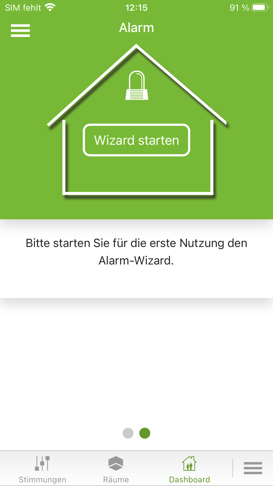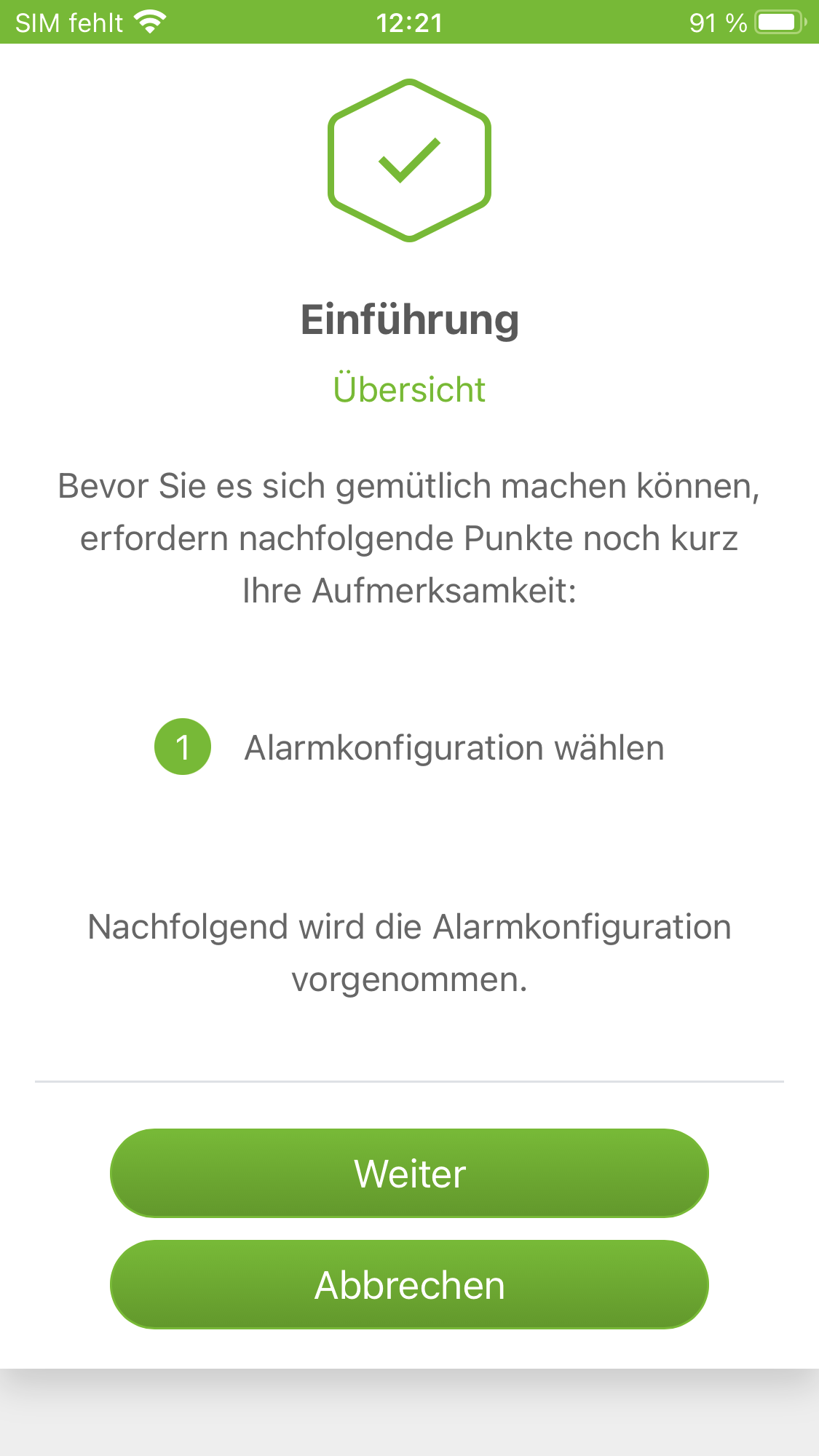 Die Einrichtung erfolgt bequem per Einrichtungsassistent (Wizzard). Dabei werden schrittweise alle Konfigurationspunkte durchlaufen und die vom System unterstützten Geräte berücksichtigt. Eingebunden werden können Tür-Fensterkontakte, Kameras, Bewegungsmelder und weitere Sensoren unterschiedlichster Hersteller. Die Unterstützung inkludiert zusätzliche Gerätefunktionen wie Sabotagekontakte und Meldung von schwachen Batterien. Nach dem Einrichten des Alarmsystems gelangen Anwender über den Punkt "Dashboard" der TabBar in die Ansicht des Alarmsystems. Hier können verschiedene zugebuchte Themenseiten durch seitliches Wischen gewechselt werden.