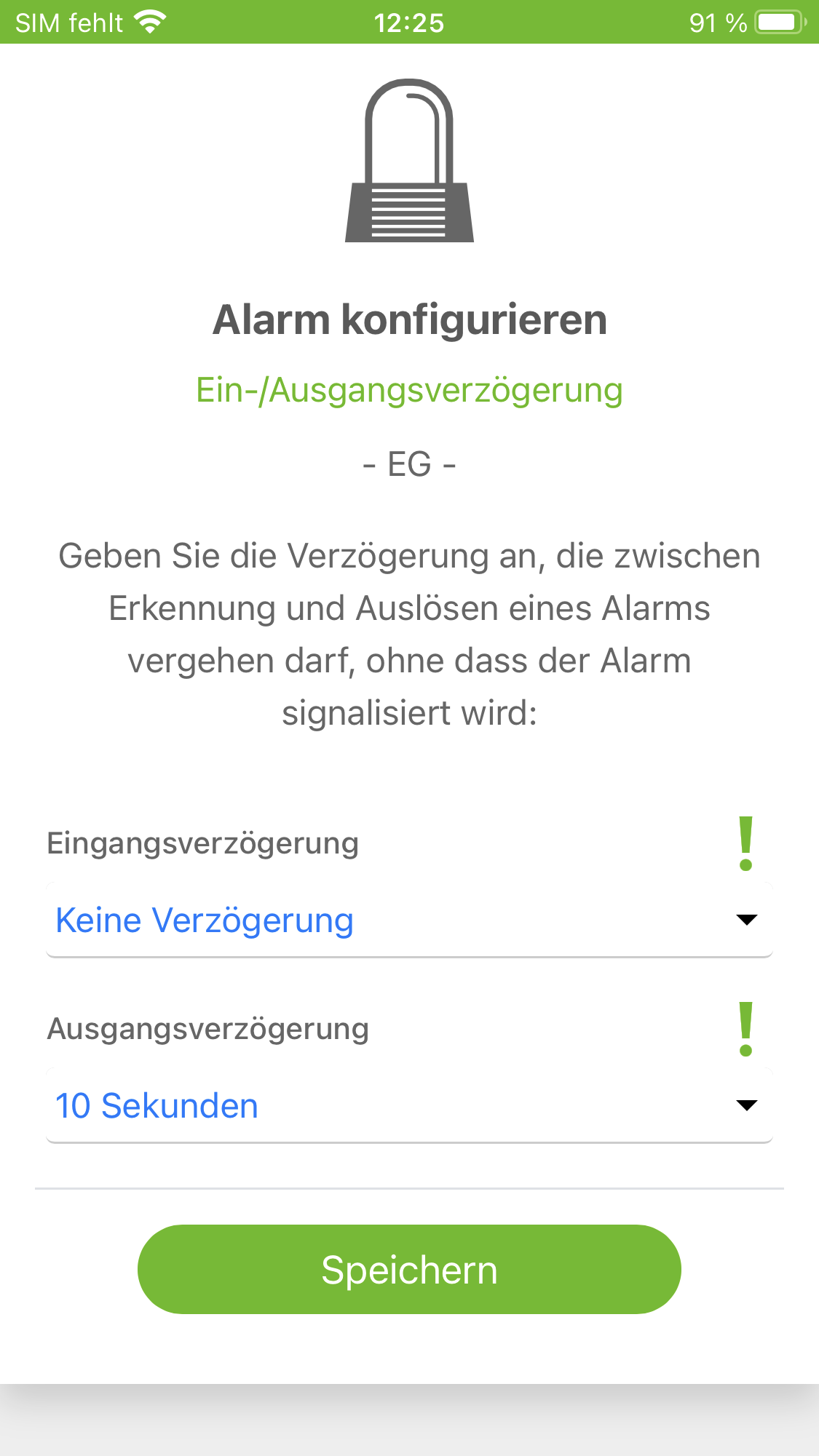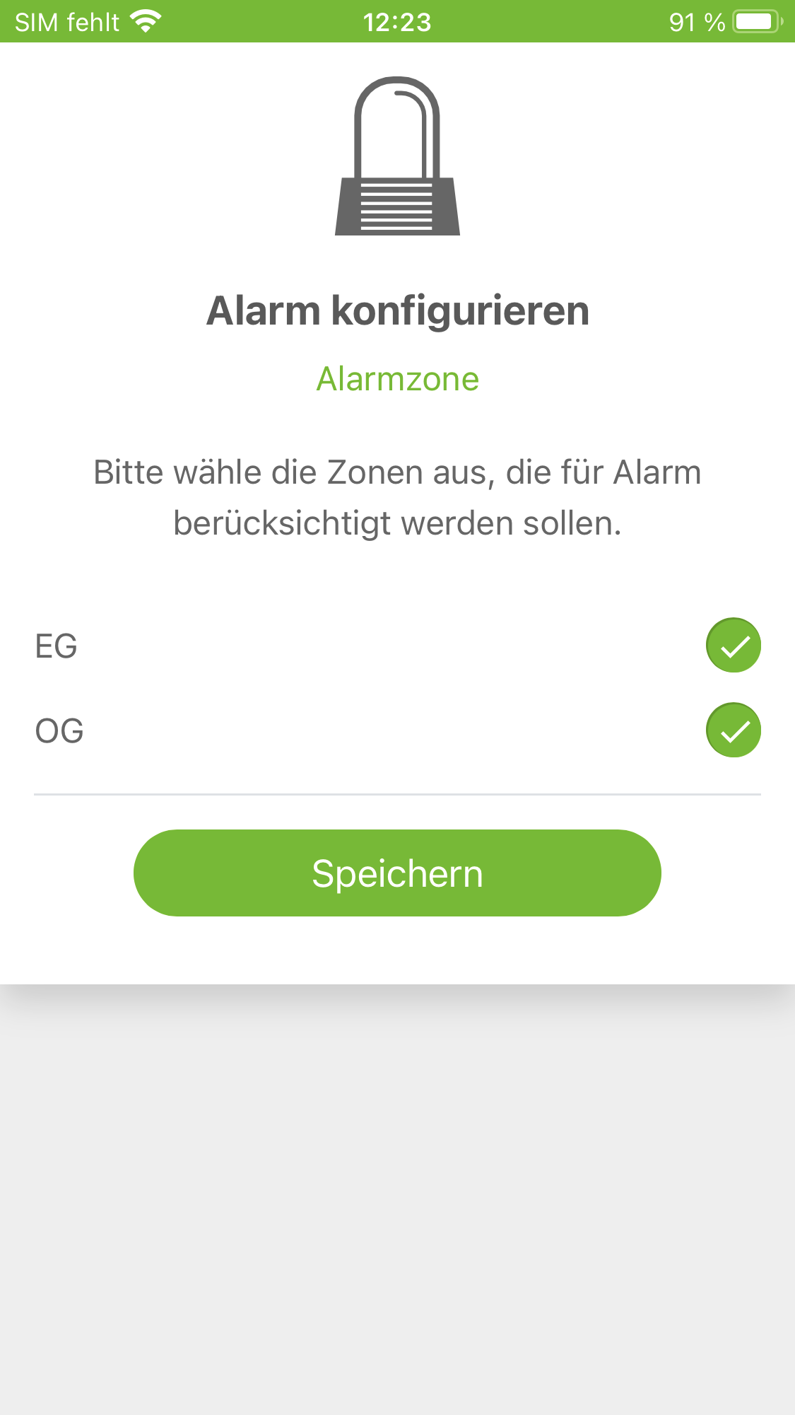 In der linken oberen Ecke befindet sich das Einstellungsmenü für das Alarmsystem. Über dieses können Einstellungen nach Wunsch auch später angepasst werden.