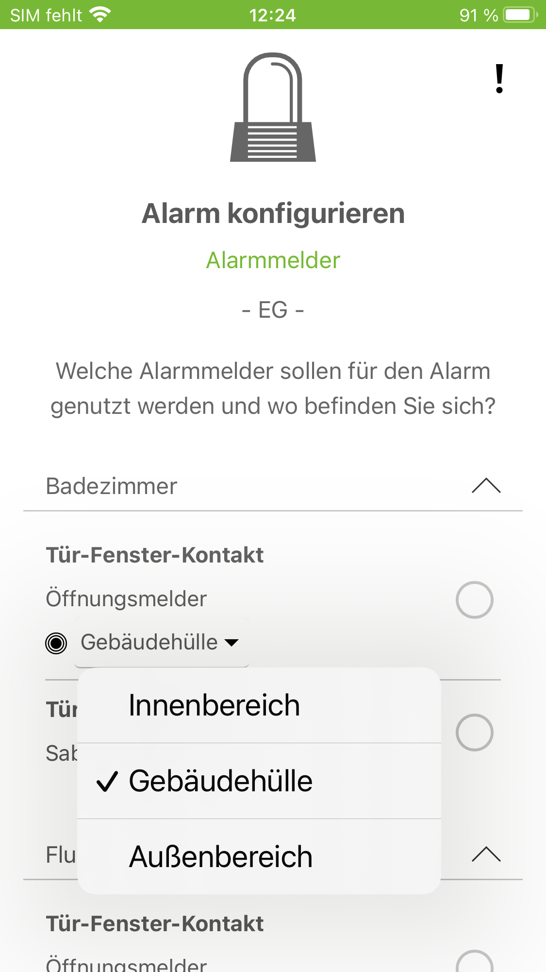 Für verschiedene Komponenten kann zusätzlich noch festgelegt werden, wo sich der Melder befindet. Abhängig von verschiedenen Alarm-Modi wie "scharf" bzw. "intern scharf" resultiert hieraus ein unterschiedliches Verhalten.