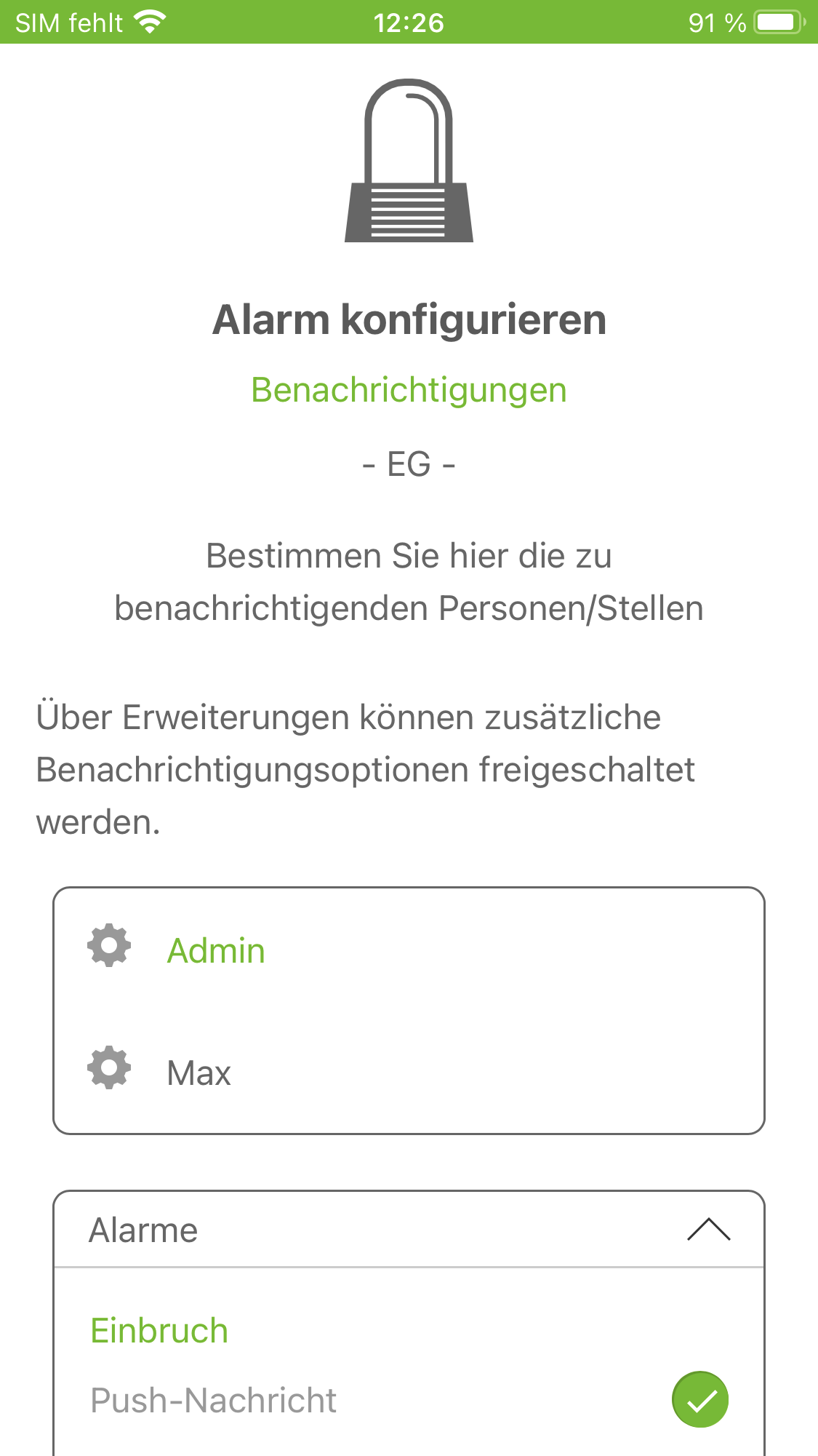 Für Sicherheitsrelevante Ereignisse wie Alarme, Alarmstatus-Änderungen und Warnungen lassen sich für jeden Benutzer abhängig von vorhandenen Benachrichtigungsoptionen (Push-nachricht, E-Mail, ...) Benachrichtigungen aktivieren / deaktiveren.