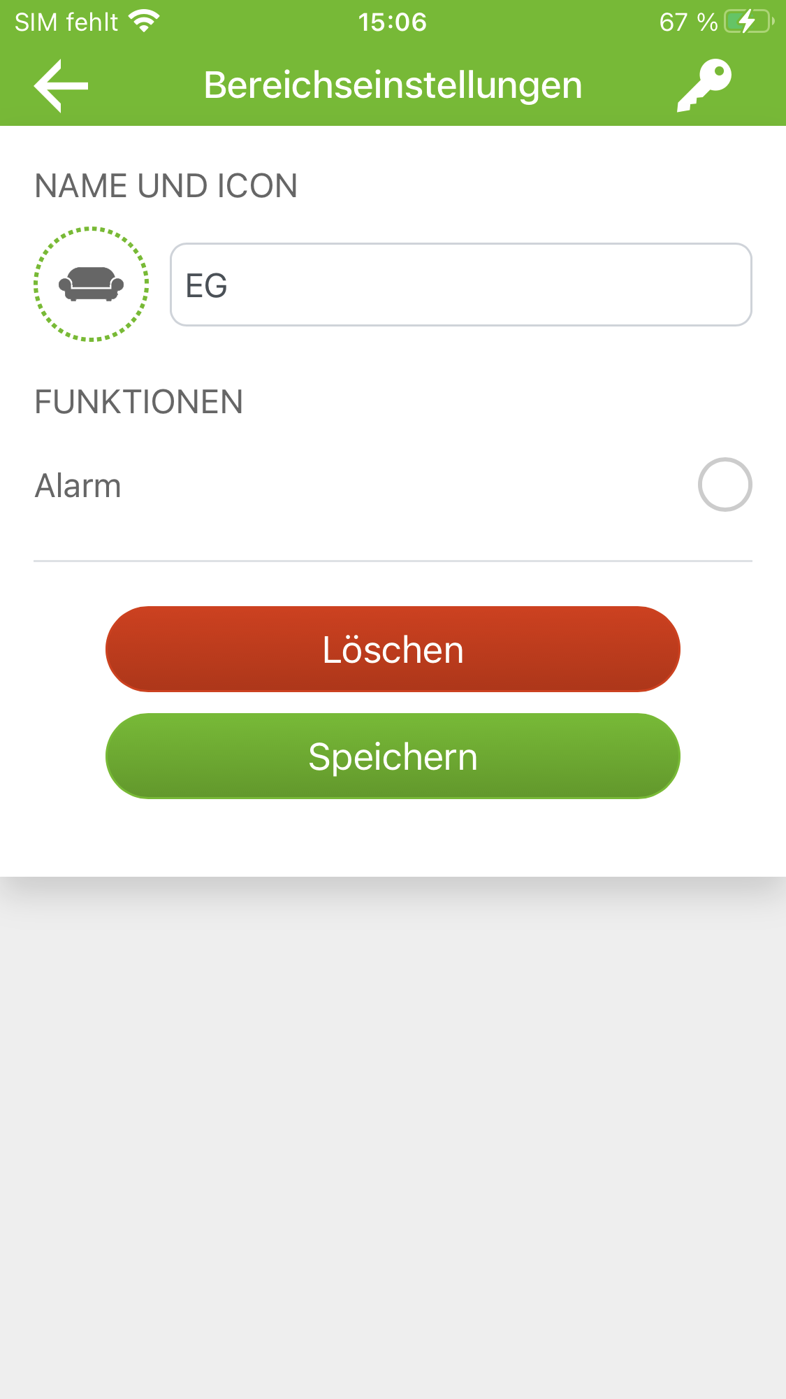 Zum Anpassen eines Bereichs reicht ein Klick auf eine Kachel der entsprechenden Zone. Danach können Änderungen von Icon oder Name vorgenommen werden. In Verbindung mit der Erweiterung Alarm lassen sich Bereiche im selben Dialog für die Alarmüberwachung aktivieren/deaktivieren.